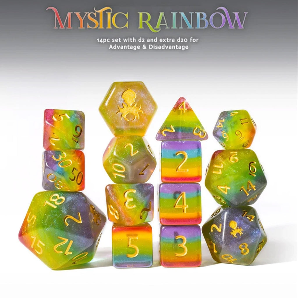 Mystic Rainbow 14pc Dice Set Inked in Gold by Kraken Dice