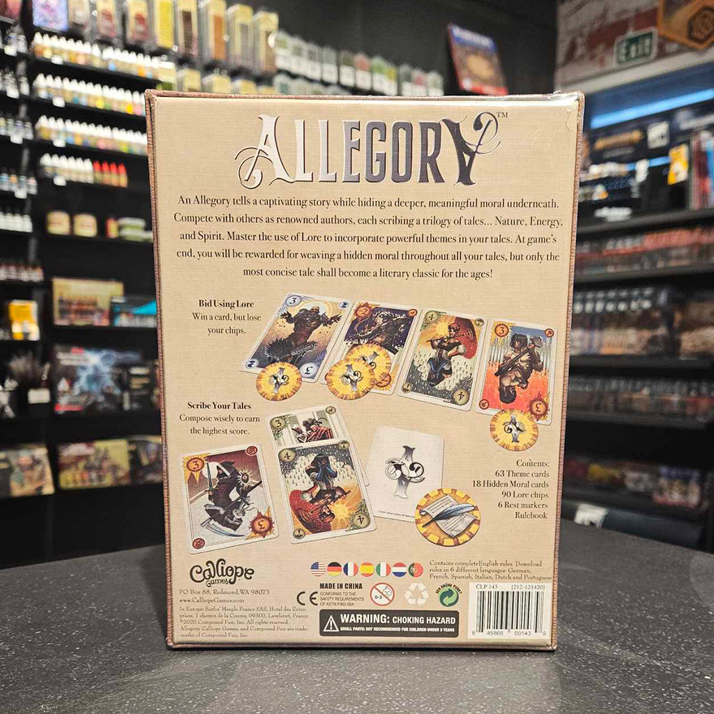 In Allegory, you are a mythic author. Bid using lore chips to collect theme cards to craft their your tales (Nature, Energy, and Spirit). In the end, you score only the tale with the lowest total value. Enhance your score by including sets of themes throughout your trilogy. Earn bonus points for including your moral in each tale. The player with most points has scribed a classic tale and mastered the allegory!