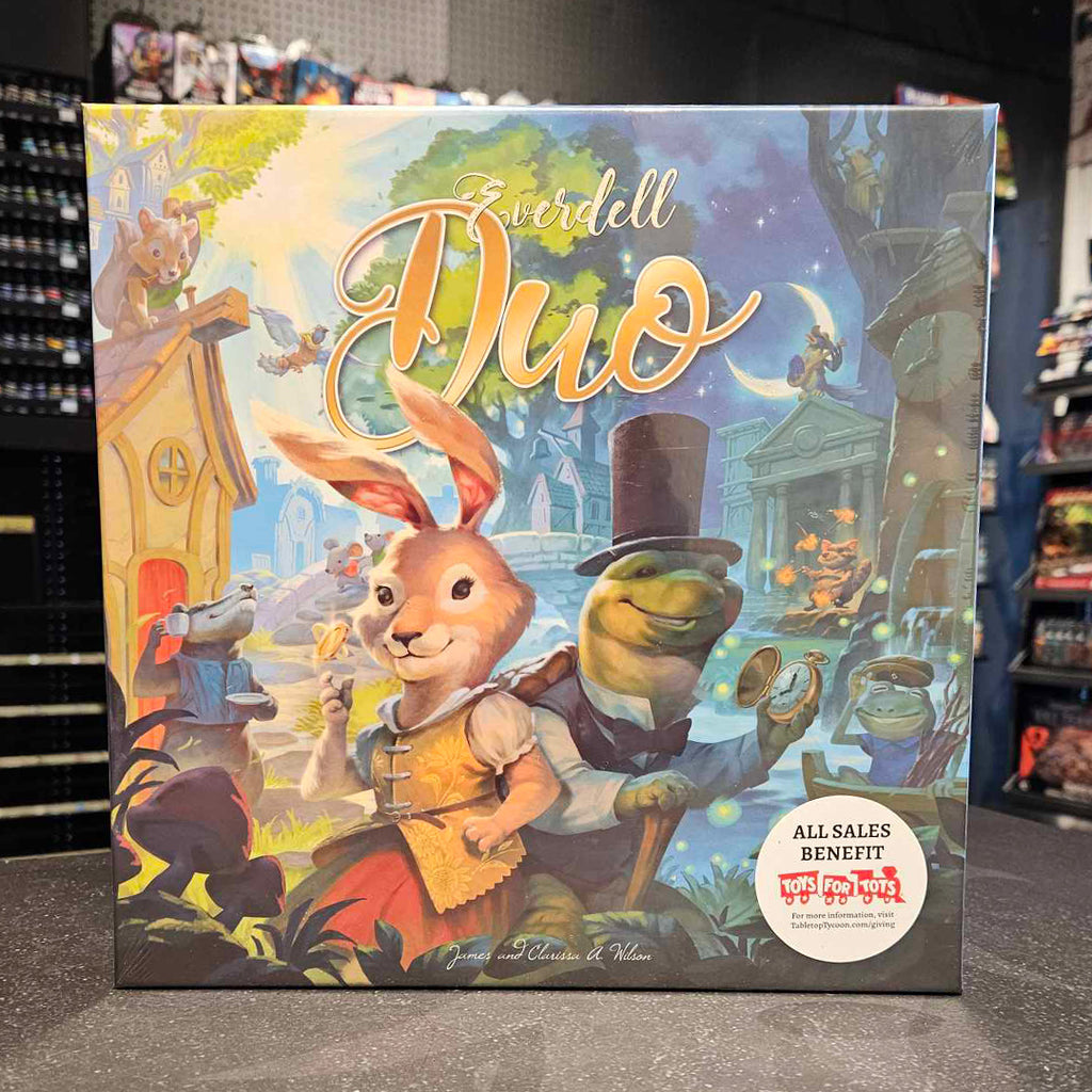 In Everdell Duo, you either compete against your single opponent or play co-operatively with another player to earn the most points. You accomplish this by placing workers to gather resources, then use those resources to play cards face up in front of you, creating your own woodland city.