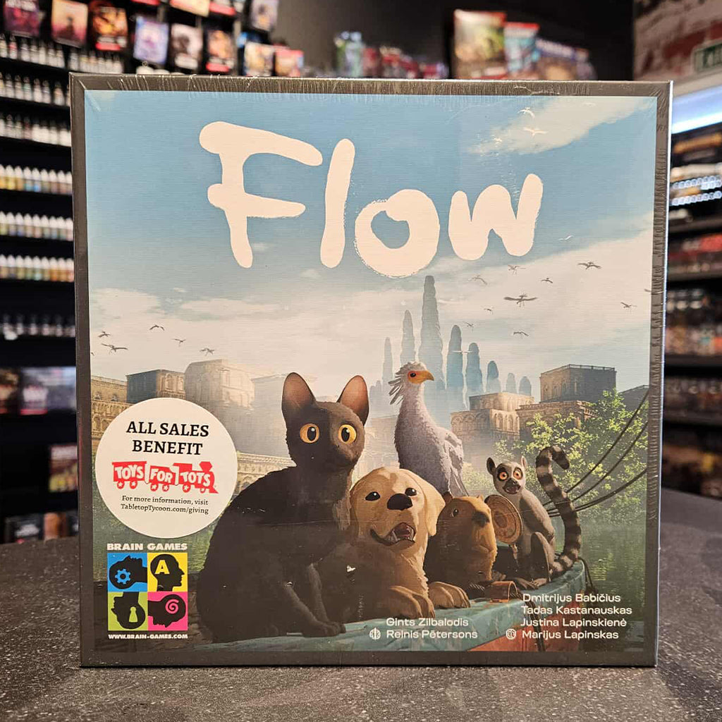 Flow is a cooperative game where players work together to connect four animal spaces to the boat tile in the center of the board by drawing and playing tiles. If players run out of tiles they and the animals have not been connected to the boat, they all lose. On top of that the game uses a timer, and each time it runs out, players roll two dice that tell them where the giant wave strikes and washes away tiles already placed. Do you have what it takes to save the animals?