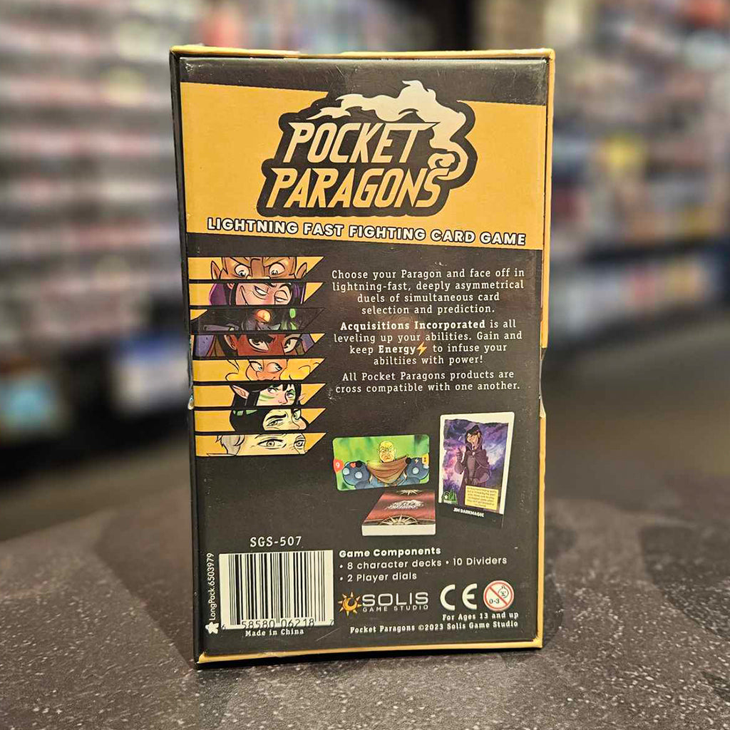 Pocket Paragons is a quick deceptively simple game of big spells and big reads. Take their HP down to 0 or deliver a carefully placed Execute to take your opponent out in an instant! This box features 8 characters from Penny Arcade's Acquisitions Inc. !