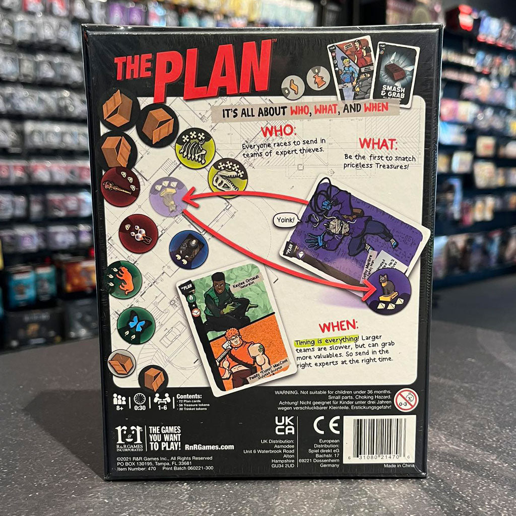 The Plan is a fast-paced, light, card-management game with set-collection goals. In this simultaneous-play game, players form teams of expert thieves and attempt to steal valuable treasures from the museum in a series of heists. Each round, new treasures become available. However, treasures may be stolen only by experts in the specific field. The masterminds must try to assemble the best team to send in. The treasures collected range from valuable jewels, to ancient artifacts, to priceless paintings, so the team assembled must match the treasure available.