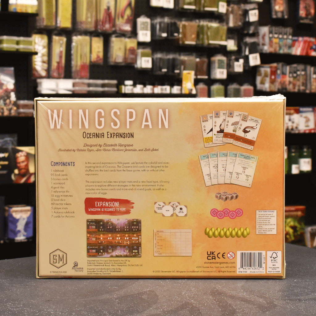 Wingspan: Oceania Expansion focuses on birds in Australia and New Zealand. It's designed by Elizabeth Hargrave and features birds illustrated by Natalia Rojas and Ana Maria Martinez.
