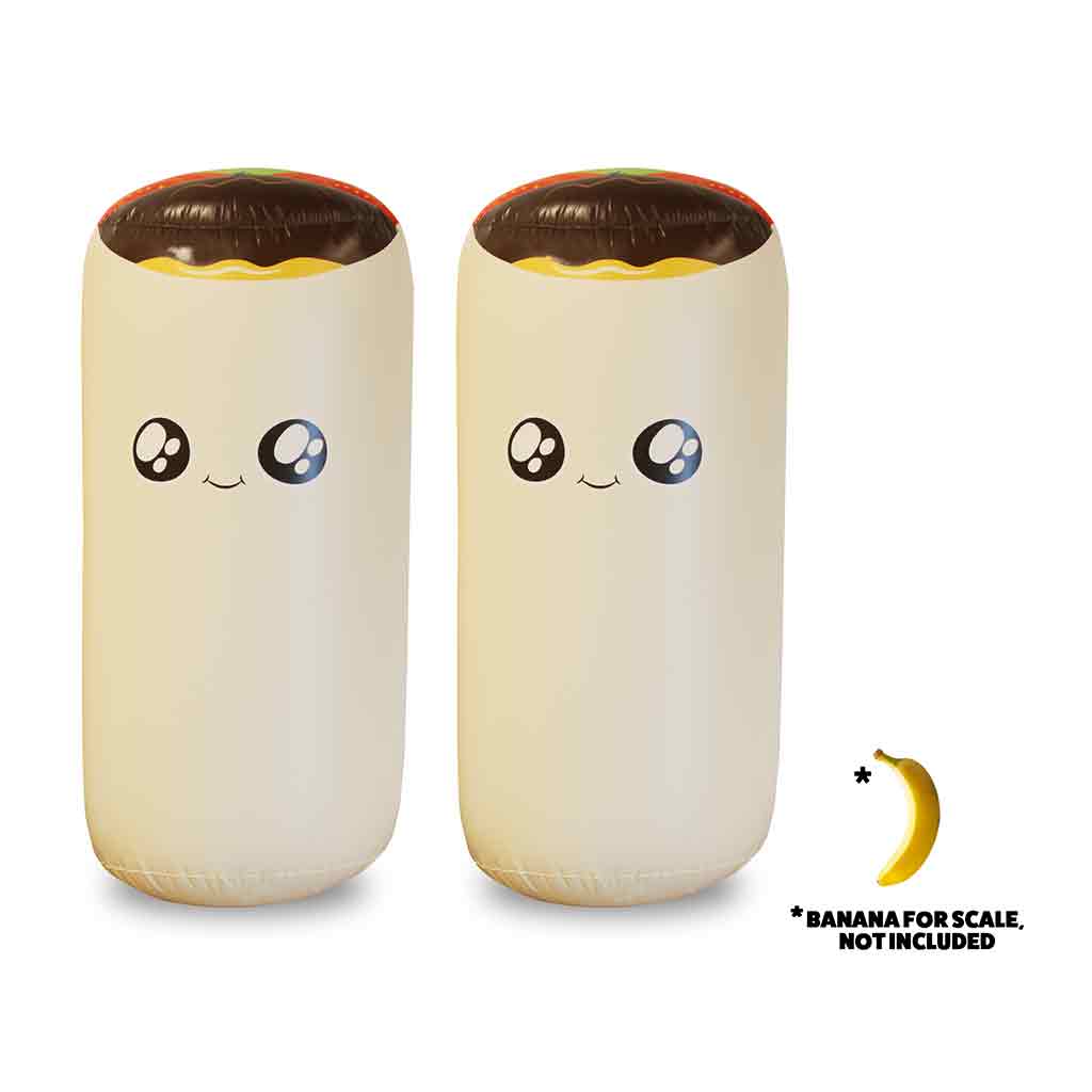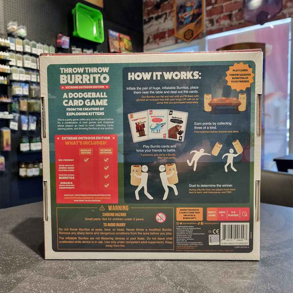Throw Throw Burrito Extreme Outdoor Edition has all the fun stuff of the original game but we've seriously upgraded the throwable Burritos. Instead of throwing squishy foam at each other, you get to launch GIGANTIC INFLATABLE BURRITOS at your friends while playing with hilarious oversized cards. Includes super durable, water-resistant oversized cards, instructions, tokens, and two 91cm inflatable burritos.