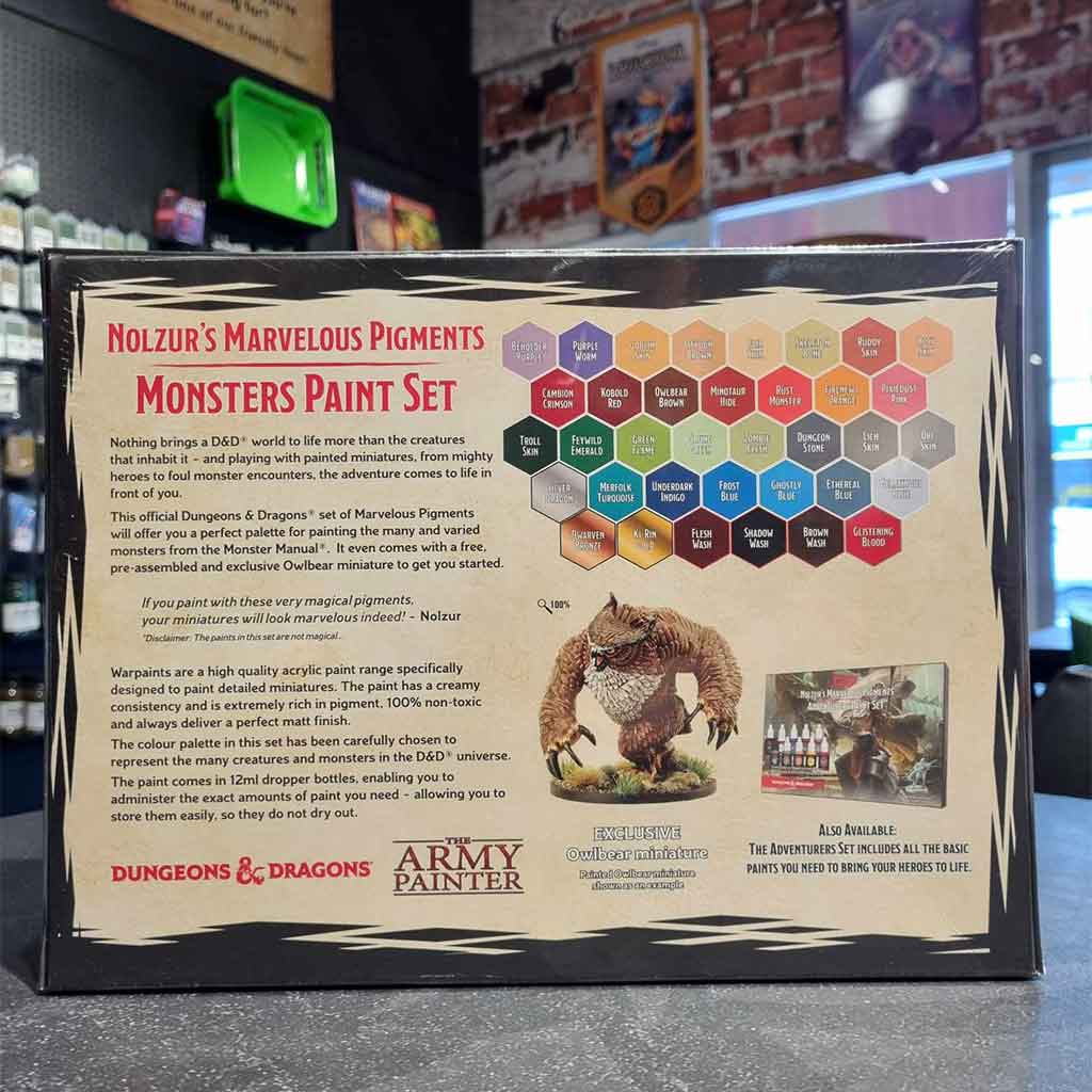 This official Dungeons & Dragons set of Marvellous Pigments will offer you a perfect palette to painting the many and varied monsters from the Monster Manua and it comes with a free, and exclusive Owlbear miniature to get you started. Miniature may require assembly.