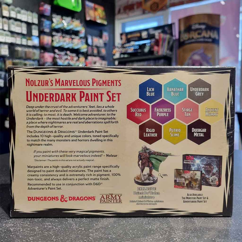 D&D Underdark is an expansion set to Nolzur’s Marvelous Pigments painting series. 10 high-quality acrylic paints toned specifically to match many monsters and horrors dwelling in this nightmare realm. The Underdark Set includes 8 colors unique to Dungeons and Dragons, and also comes with an exclusive Drizzt Do’Urden miniature included in the set.