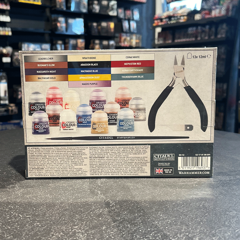 The set contains 13 Citadel Colour paints in 12ml pots, featuring the necessary colors for your first models, especially suited for Space Marines (Ultramarines Chapter) and Tyranids (Hive Fleet Leviathan).