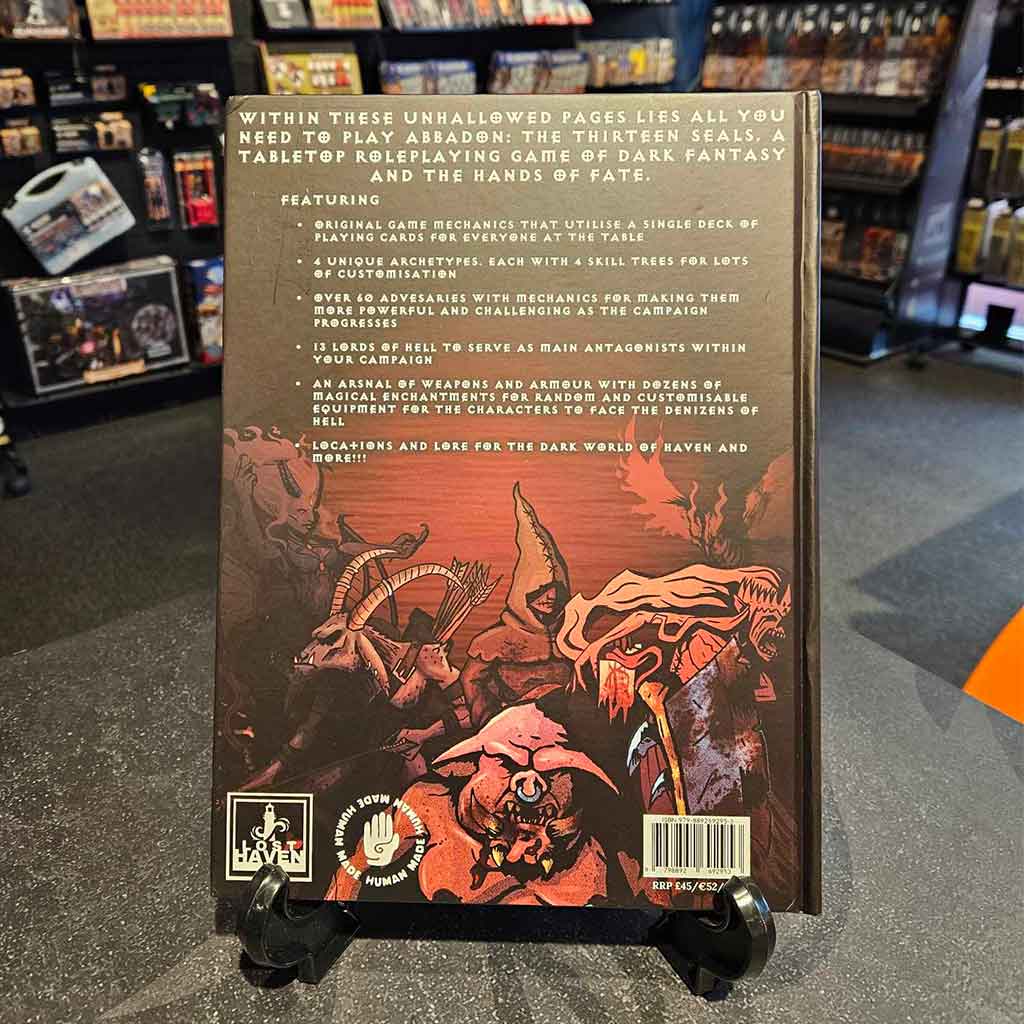 ABBADON The Thirteen Seals is a Tabletop Role Playing Game (TTRPG) with an unusual twist; it uses a standard 54-card deck, including jokers, as the determining factor for character actions.