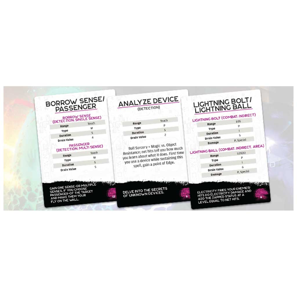 Mobile Grimoire features 52 spell cards for use with Shadowrun: Sixth World and provides references to dozens of spells, with game stats and rules, so you can select, cast, and go.