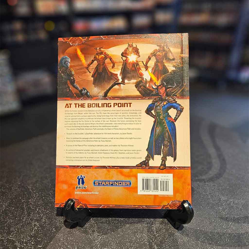While the heroes recover in the liberated sun-city of Kahlannal, efreet launch an assault on the Burning Archipelago from deeper within the sun. The PCs have the advantages of position, knowledge, and surprise, giving them a unique opportunity. Using technology from their new allies, the anassanois, the PCs can approach stealthily to infiltrate the efreeti base known as the Crucible. Thwarting the invasion requires returning the Far Portal to the surface of the sun. However, the forces overseeing the base won't stand idle. In the end, General Khaim, the efreeti commander, risks everything to realize his plan to dominate the Burning Archipelago and destroy the meddlesome intruders!