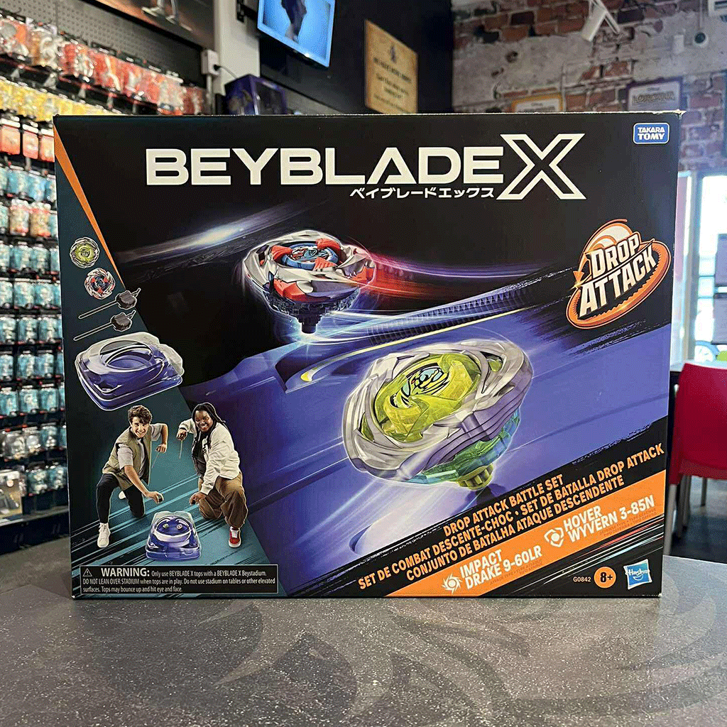 • BATTLE OUT OF THE BOX: Beyblade X Drop Attack Battle Set includes everything kids need to play and compete: Beystadium, 2 right-spinning tops, and 2 ripcord launchers. Assemble the stadium and tops, load your launcher, and 3-2-1 Let it rip!
