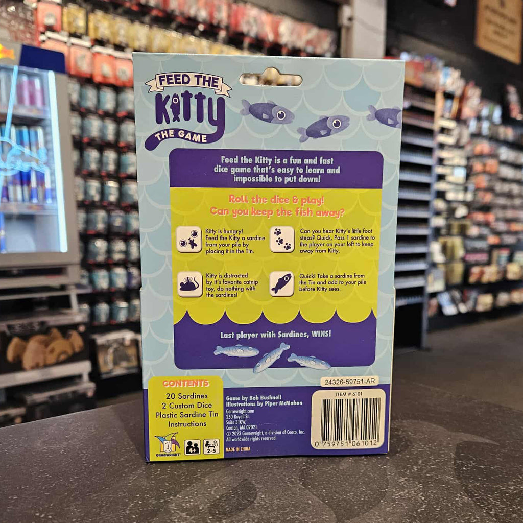 KITTY IS HUNGRY! Roll the dice and either feed the kitty, pass the sardines to your left, or take a sardine from the tin. If you run out of sardines, you’re out of the game!
